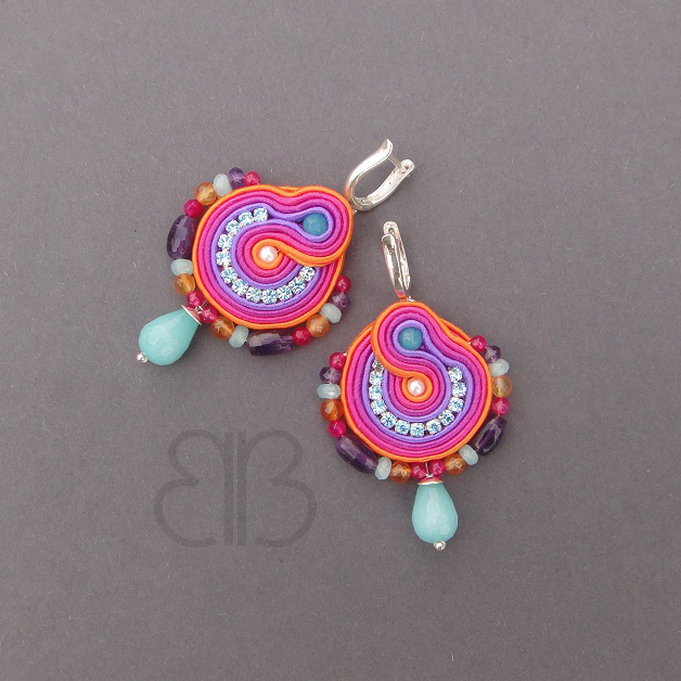 "Hawaii" - to bardzo kolorowekolczyki sutasz, pasujące do wielu letnich stylizacji. Naładowane pozytywną energią, ożywią nie jeden strój. Głównym elementem kolczyków są pięknie ubarwione pastylki muszli Paua, które okalają tasiemki sutasz oraz taśma z cyrkoniami w kolorze turkusowym. Dopełnieniem projektu są kolorowe kamienie w postaci oponek i kropli oraz modne mini chwosty. Kamienie wykorzystane w tym projekcie to: jadeit pomarańczowy, howlit turkusowy, jaspis lemon, karneol. ametyst. Tył został wykończony skórką naturalną w kolorze różowym. Wymiary: około 9 cm długości wraz z biglem na 6 cm szerokości. Kolory ze zdjęć mogą nieznacznie różnić się w rzeczywistości w zależności od indywidualnych ustawień Państwa monitorów. Kolczyki zostały wykonane ręcznie tzw. "haft sutasz". Tasiemki są ze sobą zszyte, a nie sklejone! Wykonane w pojedynczym egzemplarzu, co czyni je dziełem unikatowym. Zakupiona przez Państwa biżuteria, zostanie ozdobnie zapakowana. Polecam serdecznie!